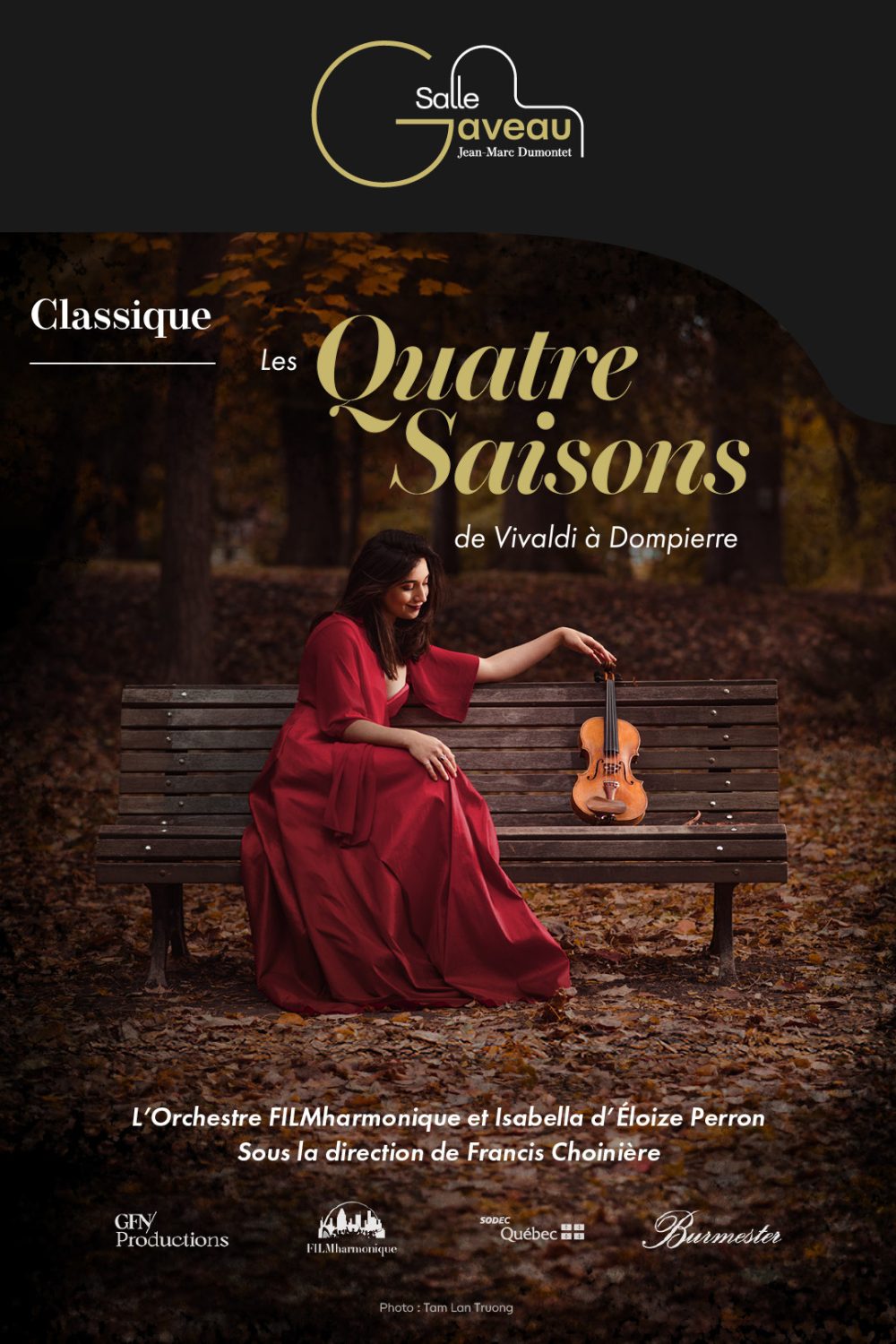 La flamboyante virtuose ne manquera pas d’impressionner lors d’une nouvelle série de concerts passionnants. Interprété par l’Orchestre FILMharmonique sous la direction de Francis Choinière, Les Quatre Saisons de Vivaldi sera porté par un souffle de jeunesse, alors que Les Quatre Saisons de Buenos Aires, signé Astor Piazzolla, nous plongera dans l’univers sensuel du tango argentin. Aussi en primeur pour cette tournée sera la première mondiale de Les Quatre Saisons du Québec du célèbre compositeur François Dompierre.
